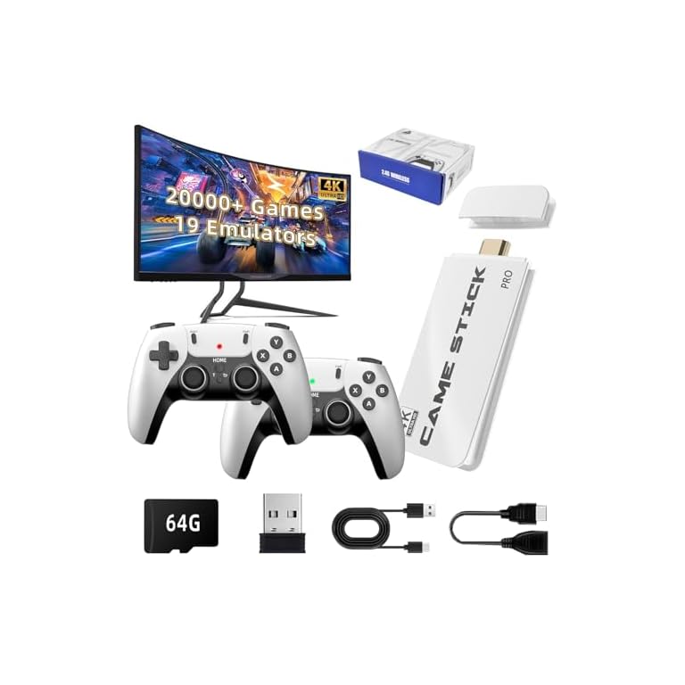 Wireless Retro Game Console Stick Built in 20,000+ Classic Games 4K HDMI Output Nostalgia Gaming Stick with Dual 2.4G Wireless Controllers 64GB Memory Card Included Plug-and-Play Retro Video Games